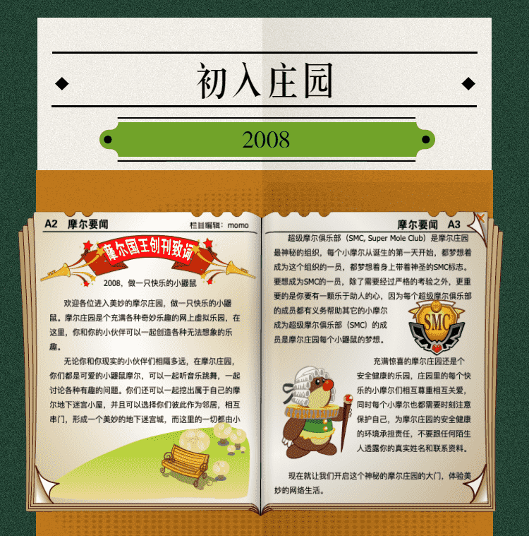 在这一年,,,,摩尔庄园诞生了。。。在这里,,大家都是可爱的红鼻子鼹鼠小摩尔,,,可以一起勤劳耕作,,,一起高山滑雪......我们都是摩尔庄园的建设者。。。。