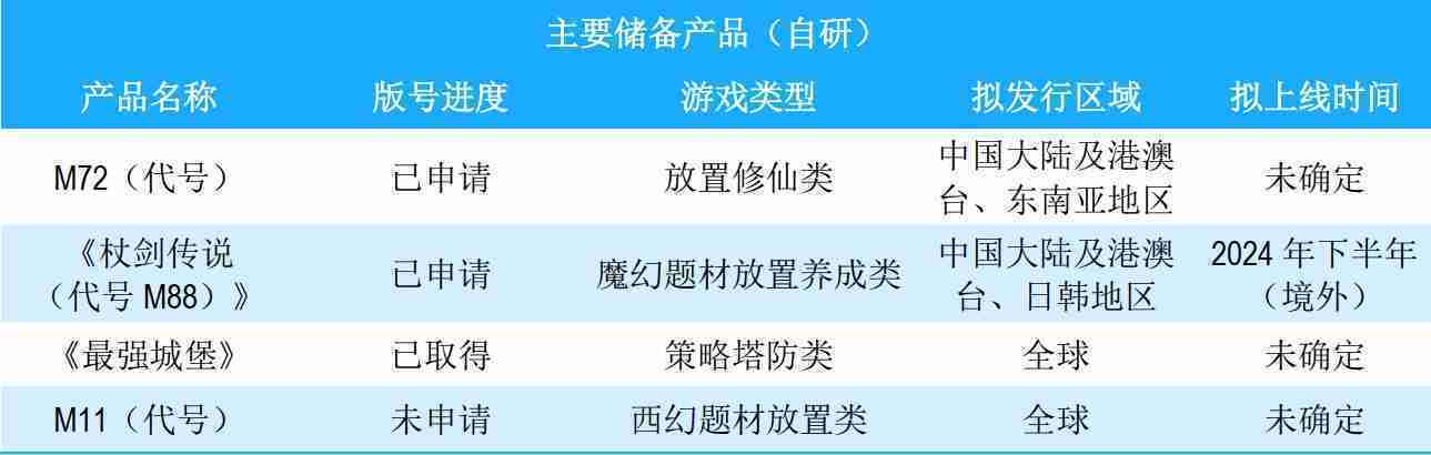 公司储备的多个自研、、、代理产品都在有序推进当中,,涵盖放置类、、策略类、、、、模拟经营类、、RPG、、、、Roguelike等多元化游戏品类,,,,储备的主要自研和代理产品如下::::