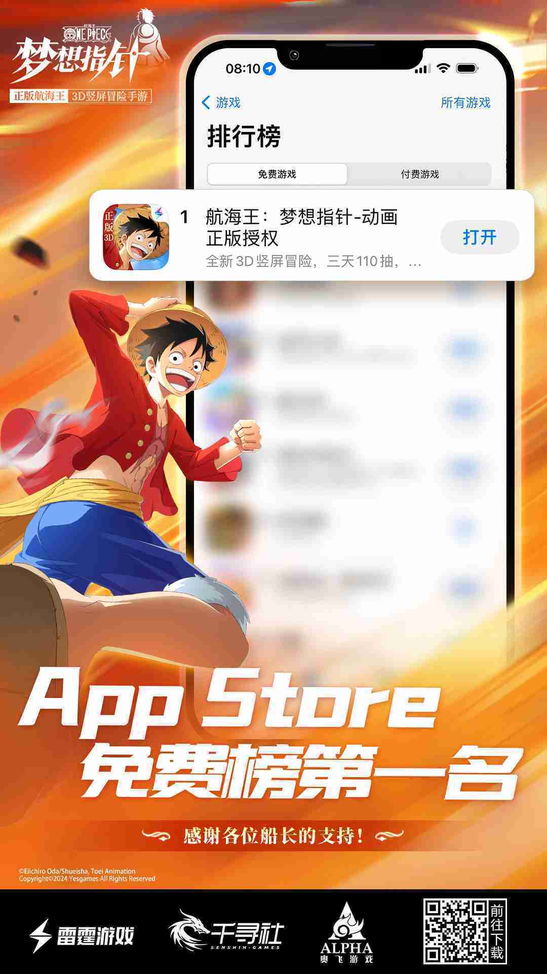 产品新闻 《航海王::梦想指针》登顶App Store免费榜,,公测福利汇总!!!!