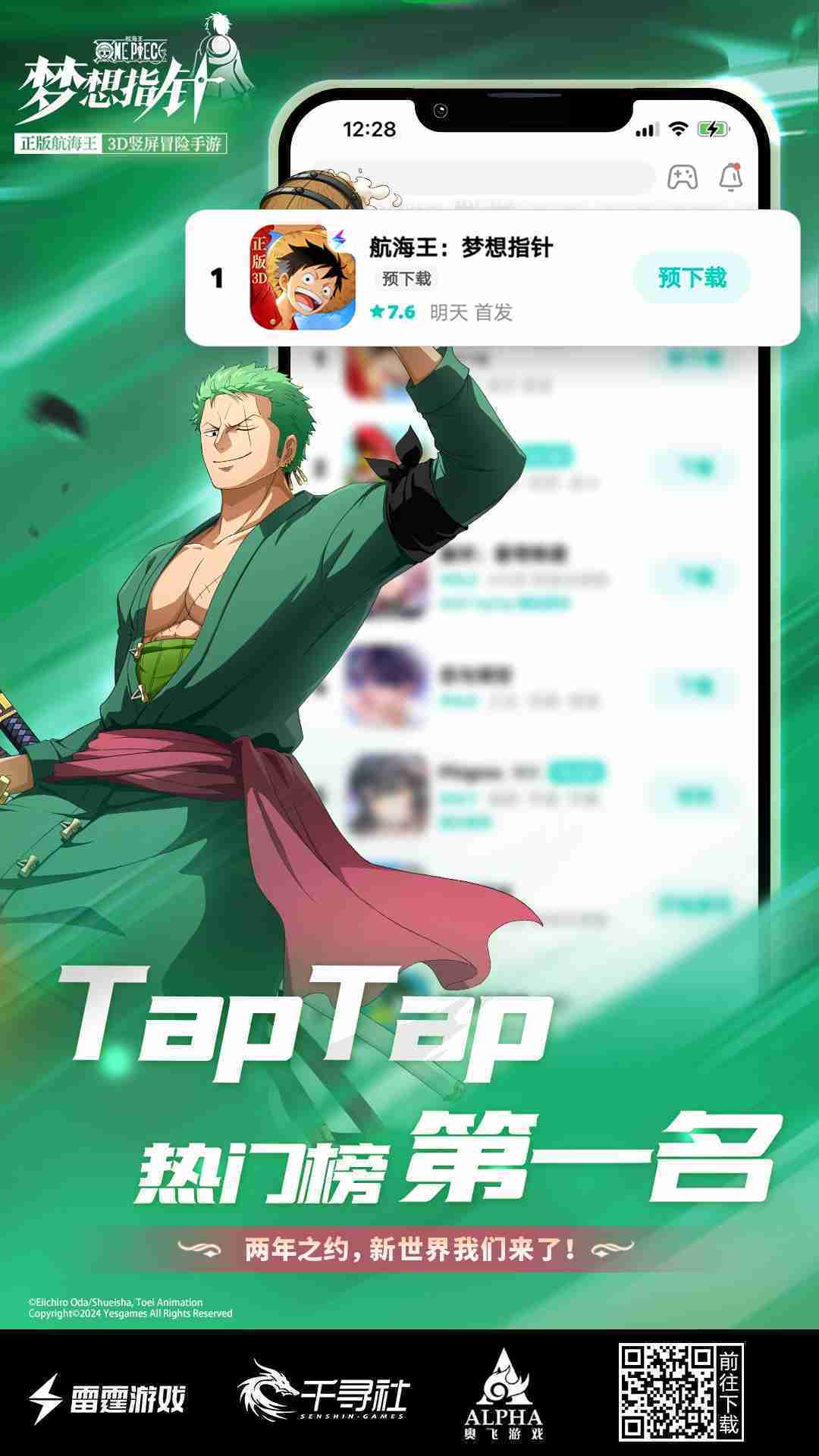 4月1日,,,手游《航海王::梦想指针》正式公测,,上线仅2小时不到就登上了App Store免费榜Top1,,,,与TapTap热门榜第一。。。。